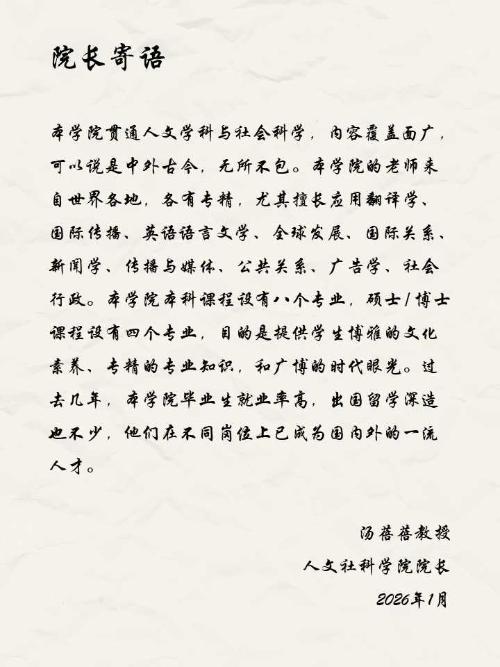 汤蓓蓓教授于2026年初加入北师香港浸会大学,出任人文社科学院院长。她的学术生涯横跨中国、英国和澳大利亚,先后就读于武汉大学、牛津大学和澳大利亚国立大学。汤教授于2015年至2025年期间任职于西交利物浦大学。在此期间,汤教授先后担任多个学术领导职务,包括中国研究系系主任 (2017-20)、人文与社科学院院长(2020-25),以及文化、传播与社会研究中心代理主任 (2022-25)。