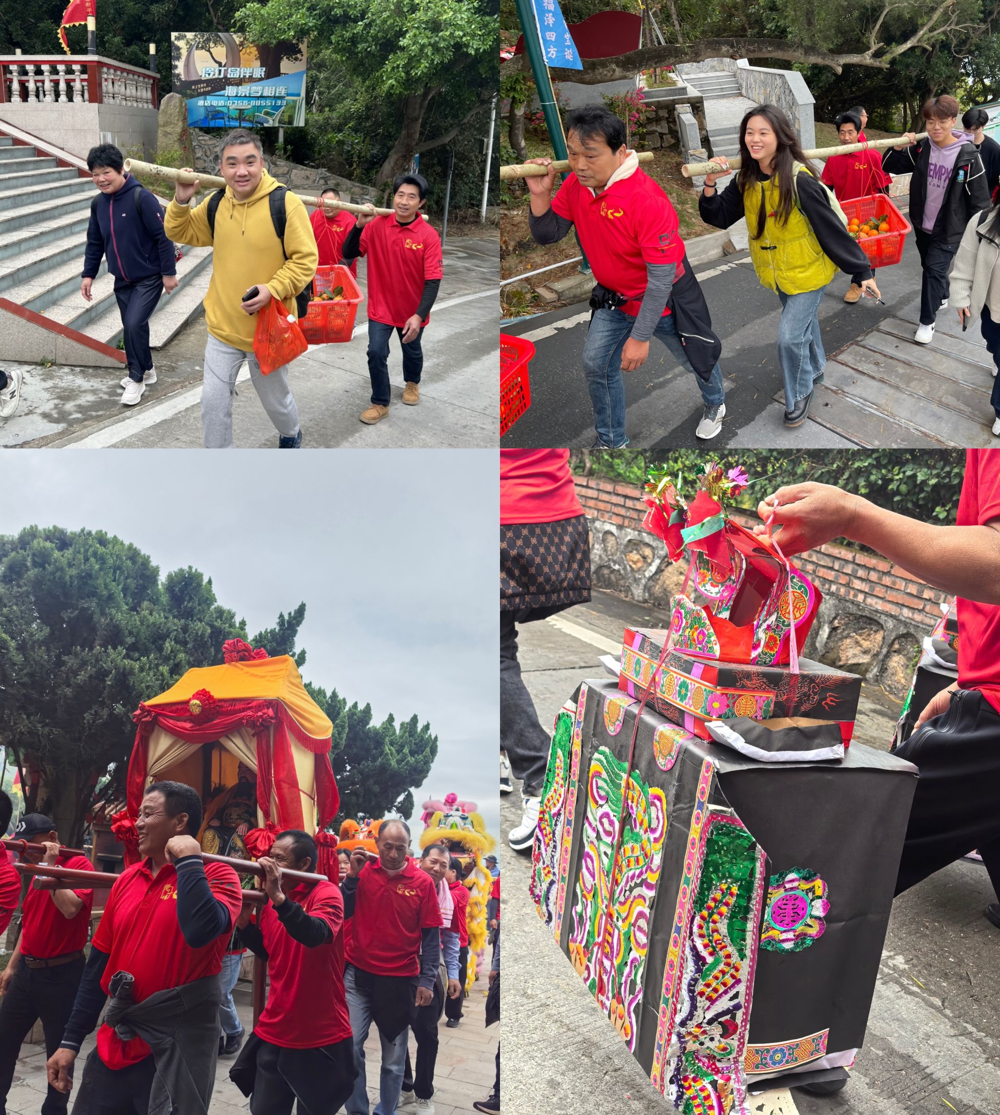 祭海仪式结束后,身着红衣的北帝诞理事会成员们将祭品装框上担,燃放鞭爆,敲锣打鼓,列队前往山上的北帝庙祈福。我校学生们跟随队伍拾级而上,期间还帮助工作人员扛担子,沉浸式体验岛民们对神灵沉甸甸的敬意。