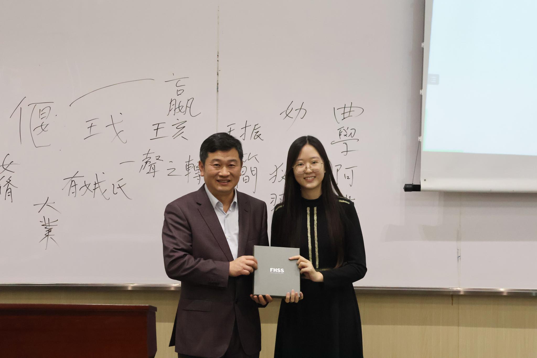 The speaker and audience had a lively discussion and interaction during the Q&A session, and Prof. Chen responded to the questions such as the classification of totem symbols and historical narratives, emphasizing that historical research should be evidence-based. Finally, Yuchen Xie, a student representative, presented a souvenir to President Chen, and the lecture was successfully concluded with a happy group photo.