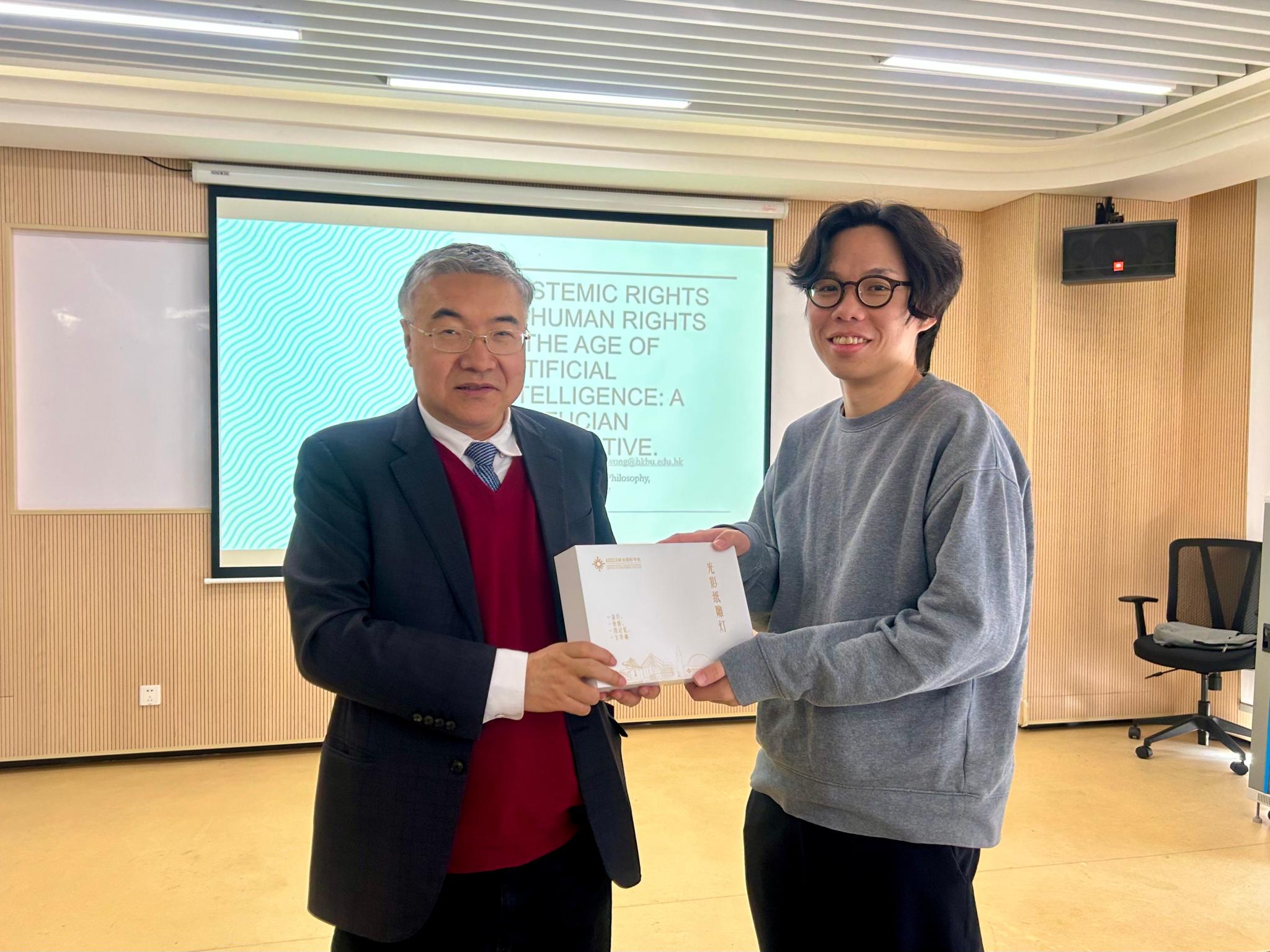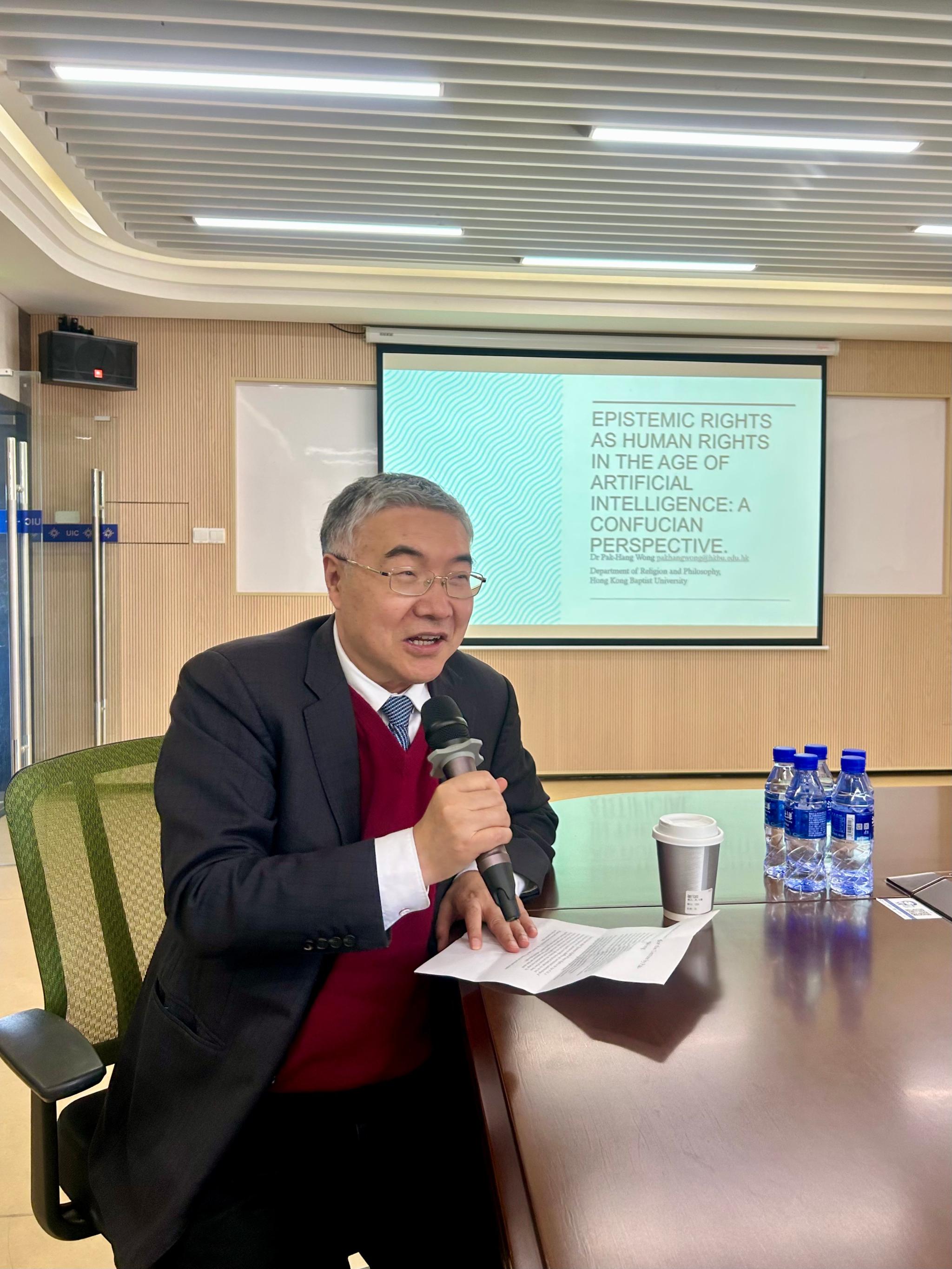 On December 13, 2024, Dr. Pak-Hang Wong, Assistant Professor of the Department of Religion and Philosophy of Hong Kong Baptist University, was invited to visit the UIC campus and gave a lecture in the afternoon, entitled “Epistemic Rights as Human Rights in the Age of Artificial Intelligence: A Confucian Perspective”. The lecture was hosted by Prof. Li Jianhui, Academic Registrar of UIC, and attended by Prof. Tze-Ki Hon, Dr. Jianning Chen, Dr. Bo Yan, Dr. Iceman Leung from SCC, Dr. Kar Bo Wong from SGE, and some students.