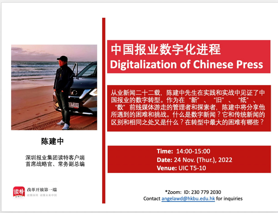 Mr. Jianzhong CHEN, Chief Strategy Officer of Shenzhen Press Group DuteNews and Executive Deputy Editor-in-Chief was invited to Zhuhai on 24 November 2022 to deliver an industry-sharing lecture to UIC students on the digitalization process of China's newspaper industry. Mr. CHEN has been in the journalism industry for more than 20 years, and as a witness to the digital transformation of the Chinese newspaper industry, he has been on the frontline of the "new", "old", "paper" and "digital "He has a unique and profound insight into the Chinese newspaper industry as a manager and explorer who has been on the front line of media transformation. In his lecture, Mr. CHEN discussed three main issues with the audience: what is digital journalism, what is the difference between digital journalism and traditional journalism, and what are the biggest difficulties for the Chinese newspaper industry in its transformation? The attendees benefited greatly from the lecture.