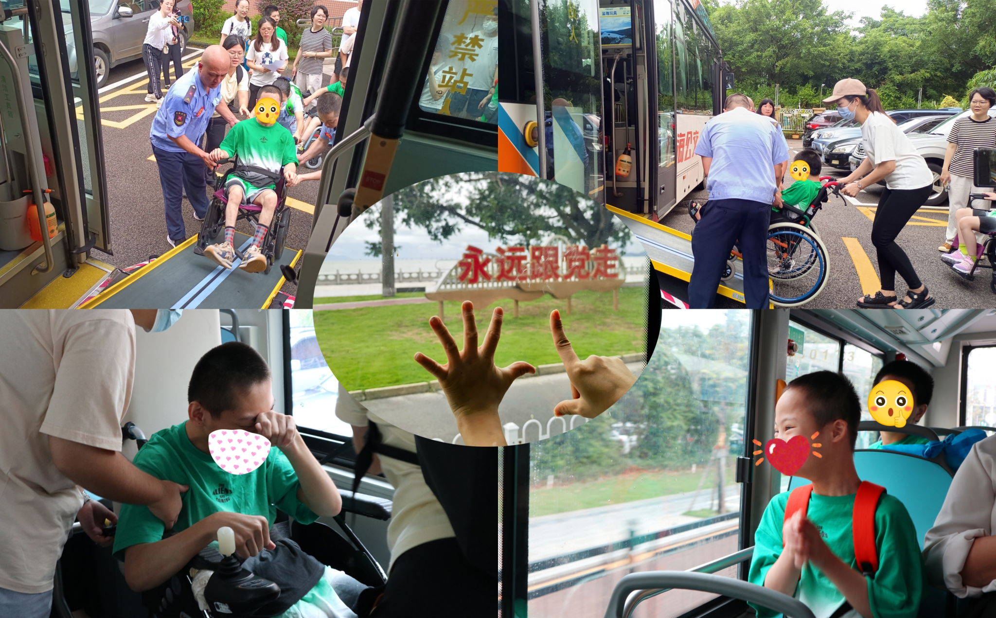 此次出行搭乘的是一辆经过改造的无障碍公交车,设置了供轮椅上下的踏板通道。福利中心的孩童们首次集体乘坐公交巴士出行,透过大玻璃窗看着沿途风景,心情都非常愉悦,有的鼓掌、有的用小手比成一朵花来表达他们这一刻的感觉。