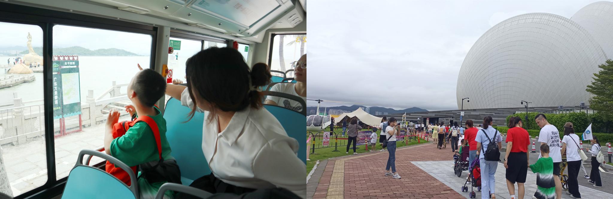 此次出行搭乘的是一辆经过改造的无障碍公交车,设置了供轮椅上下的踏板通道。福利中心的孩童们首次集体乘坐公交巴士出行,透过大玻璃窗看着沿途风景,心情都非常愉悦,有的鼓掌、有的用小手比成一朵花来表达他们这一刻的感觉。