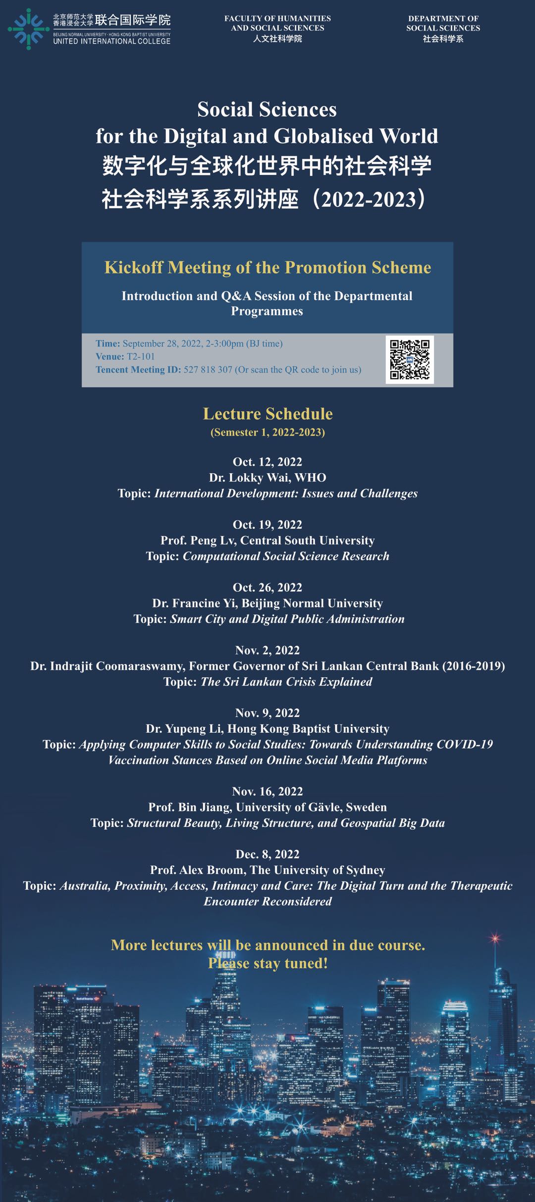 2022年9月28日社会科学系举行了2022-2023学科前沿讲座暨专业招生简介宣讲会。在社会科学系系主任兼教授王翔博士的主持下,来自数字社会科学(DGS)和全球化与发展(GAD)专业的授课老师们向学生介绍了DGS和GAD专业的具体架构以及发展前景。而系列讲座主题为“数字化与全球化世界中的社会科学”。