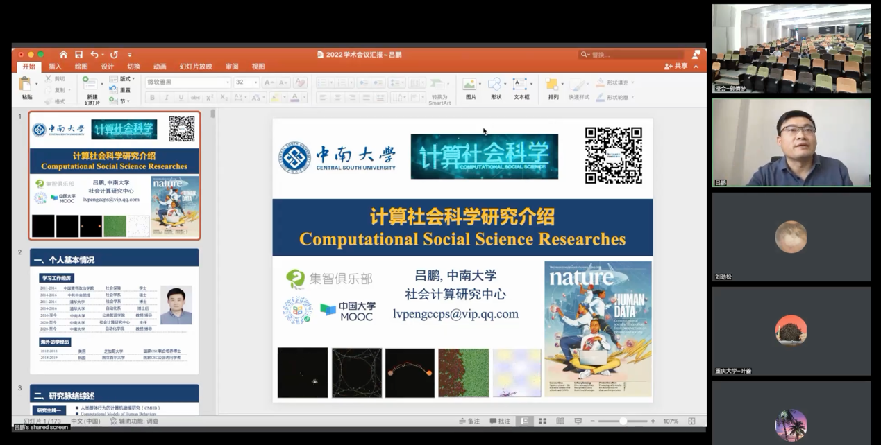 吕教授以《计算社会科学研究》为题与与会者进行了分享交流,其认为社会有机体是一个复杂社会系统,计算社会科学研究具有智能性、系统性、和进化性的优势。因此,其研究主要遵循两条跨学科的理论主线。一方面是运用自然科学的研究范式对人类群体行为与人类网络群体行为进行了计算机建模;另一方面是在社会系统的层面,通过社会有机体模拟与治理,以及社会治理研究的双向交互进行社会学科和自然学科的有机结合。
