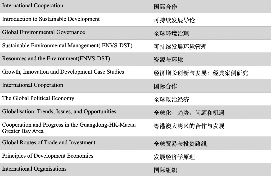 Inspired by principles of feasibility, flexibility, interdisciplinarity and relevance, GASD Minor seekers shall successfully complete 5 courses chosen freely (i.e. without any prerequisite) among the following 13 courses (11 of which are Major Required courses offered regularly by the GAD Major Programme to its own students over their Year 2-Year 4 study plan, while 2 are Major Required courses offered regularly by the Environmental Science Programme of the Division of Science and Technology):