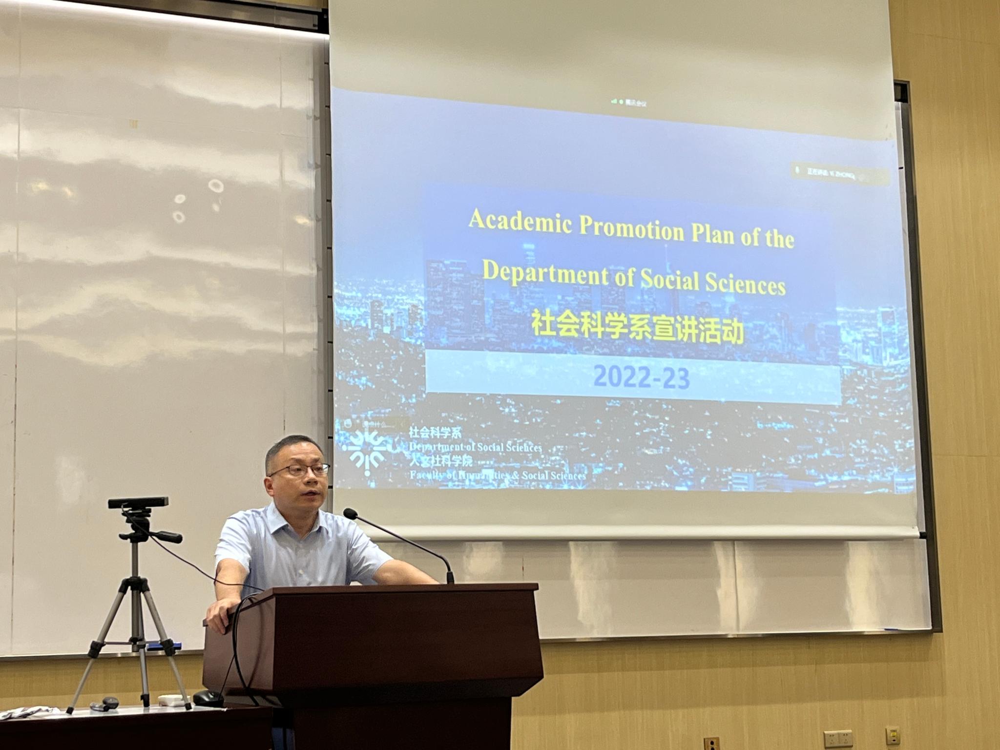 On 28 September 2022, the Department of Social Sciences held the kickoff meeting of academic promotion and lecture series of the 2022-2023 academic year. The meeting was chaired by Prof. Wang Xiang, Head and Professor of the Department of Social Science. The Faculty members from the Digital Social Science (DGS) and Globalisation and Development (GAD) programmes introduced to students the structure and development prospects of the DGS and GAD programmes. The theme of the lecture series is ‘Social Sciences for the Globalised and Digital World’.