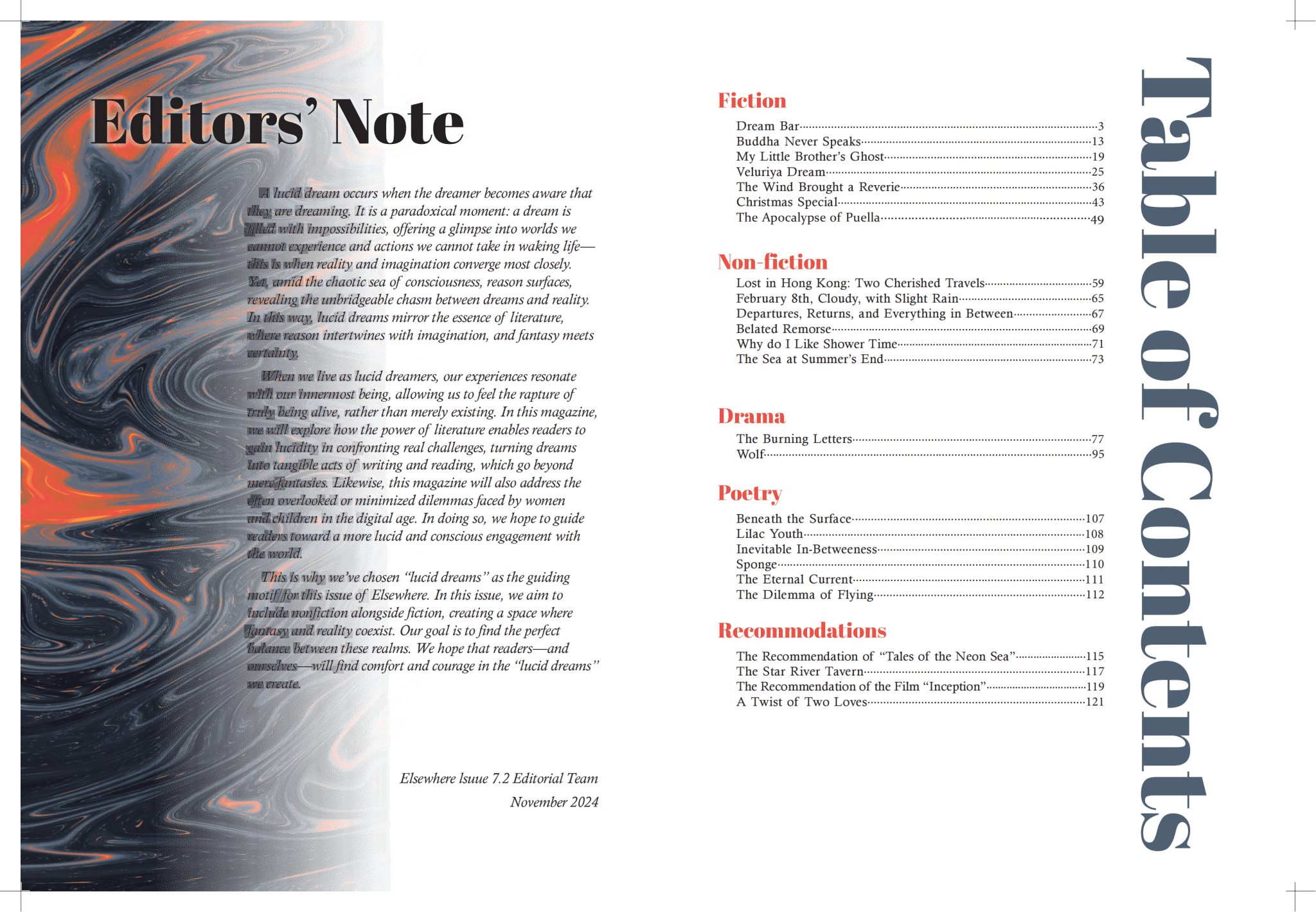 Elsewhere Issue 7.2 showcases the collective efforts of our dedicated contributors. Taking “lucid dream” as a guiding theme, this issue collects a number of works exploring the intersection of imagination and reality, demonstrating how literature can provide insight into the intricacies of daily life. We are proud of the hard work being put into creating this magazine, and we cannot wait to share it with all of you.
