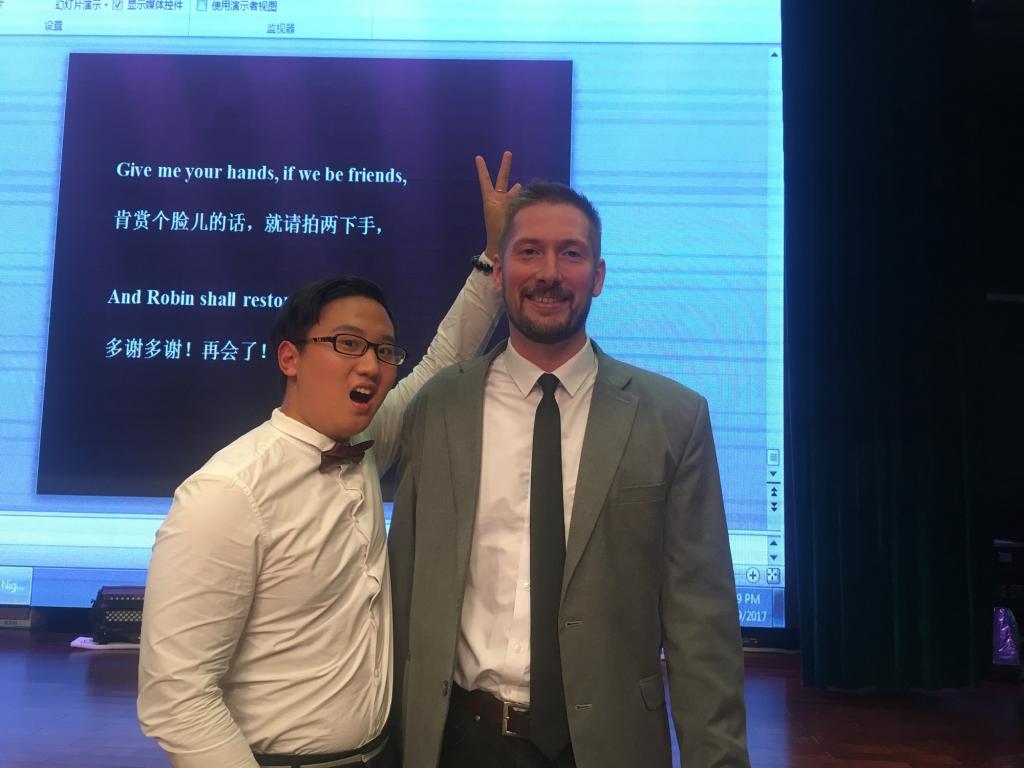 The first dramatic role I performed was in Oedipus & Antigone which was directed by Dr. Britton. Due to the time limitation of rehearsal, actors needed to balance the time between rehearsal and study. Remembering individual lines, practicing lines with partners, and correcting our pronunciation of words and so forth, all required actors’ effort and great input. During rehearsals, I was so grateful to Dr. Britton for he helped all the actors to analyze the characters’ feelings and personalities one by one, and patiently and kindly corrected our English pronunciation and demonstrated the emotions we should perform in our lines.