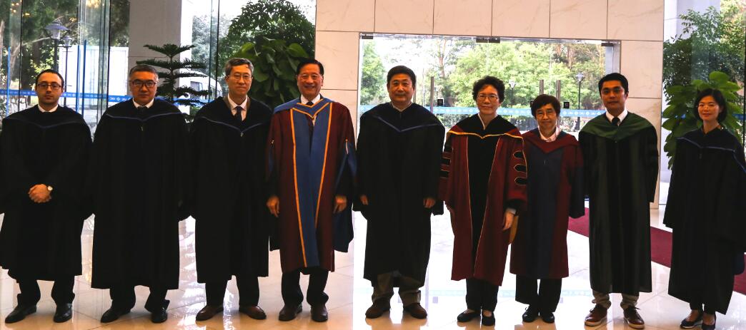 Other members of UIC administration attended the event in their academic robes. UIC President Ng Ching-Fai presented Guo with a souvenir from the evening, a set of sterling silverware in a gold box.