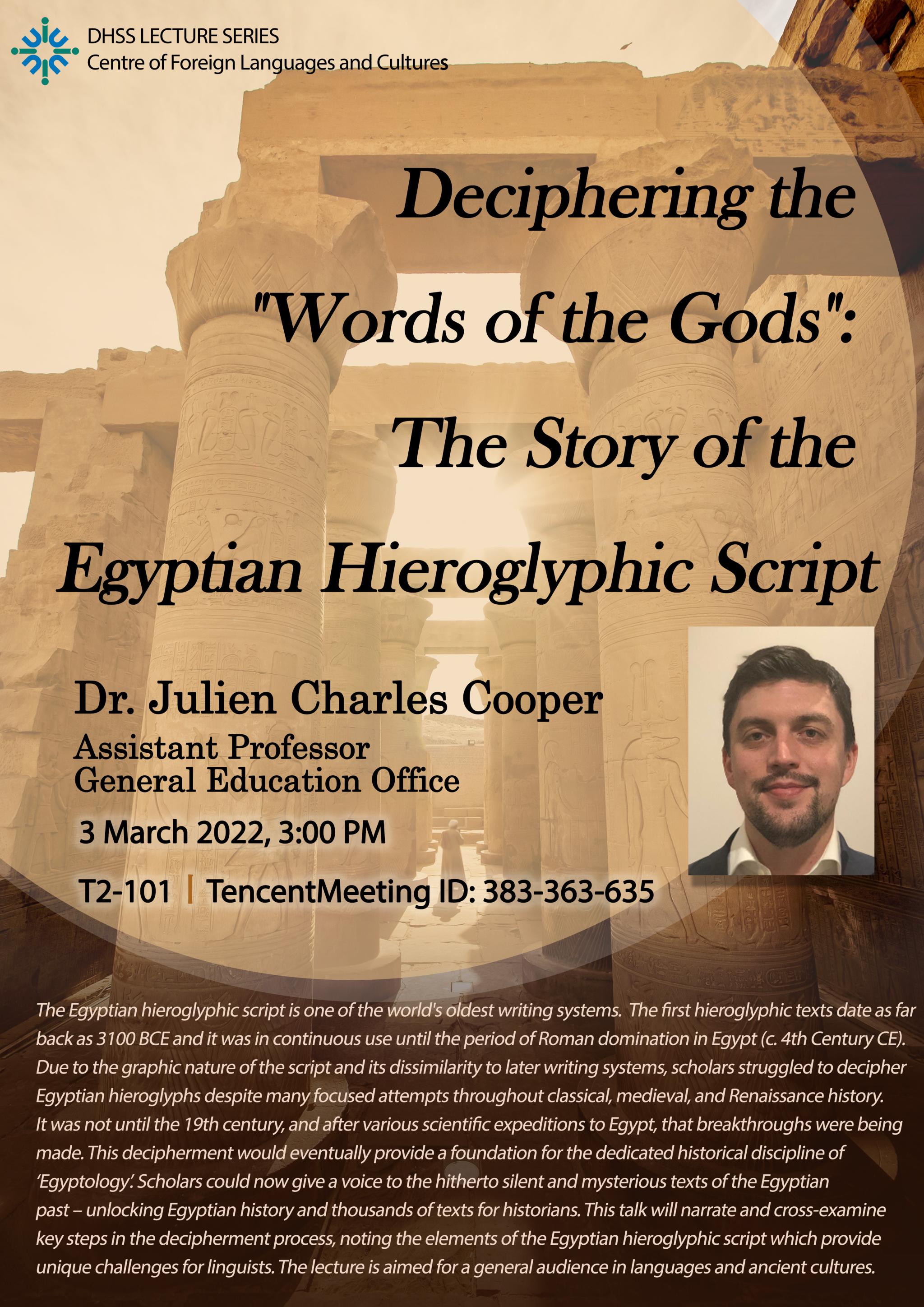 On Thursday 22 March 2022, the CFLC offered an academic lecture, entitled “Deciphering the ‘Words of the Gods’: The Story of the Egyptian Hieroglyphic Script”, held by Dr. Julien Charles Cooper. Prof. Carlotta Viti, coordinator of the CFLC, held an opening speech, introducing to the public the keynote speaker as well as the activities of the CFLC, one of the most important centres in UIC.