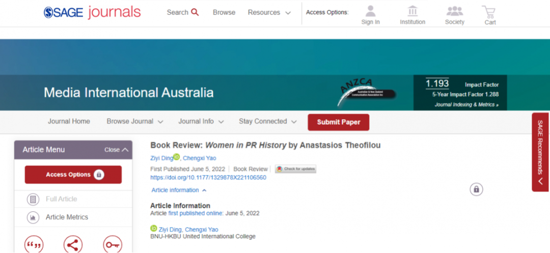 2022年6月,UIC 2020级公共关系与广告学专业学生丁子怡和姚成熙在国际SSCI期刊Media International Australia (MIA)上发表题为Book Review: Women in PR History by Anastasios Theofilou的书评文章。