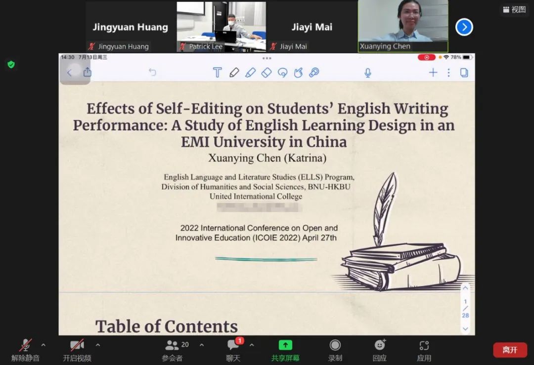 2022年7月,UIC 2018级英语语言文学专业麦嘉仪、杨熠、黄靖媛、陈宣颖和郑雨宁五位同学在线参与在香港举行的2022开放与创新教育国际会议(ICOIE 2022)并发表论文。其中,麦嘉仪获得本届大会最佳学生论文奖。