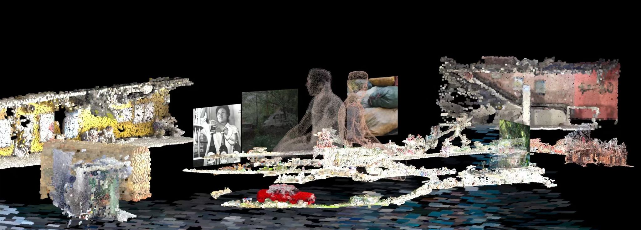 李雨珊同学此次展示的研究课题为《重塑集体记忆:VR作为召唤数字幽灵的媒介》,该课题由其与CCGC的助理教授李孟祺共同完成。研究聚焦一款由李雨珊本人参与开发的沉浸式VR游戏,通过结合人工智能叙事与三维高斯投影(3D Gaussian Splatting)技术,复原中国城市中濒临消逝的文化景观。玩家可在虚拟城市中游历,随机触发他者记忆片段,这些片段来自团队对地方居民的实地访谈,涵盖图像、视频与口述文本等多种媒介形式。比如,游戏中的一个还原场景是香港的寮屋区。寮屋区曾是贫困家庭的栖息地,后由于安全隐患引发火灾,造成该区域的损毁。通过对这一场景的数字重建,游戏实现对集体创伤的复原,让玩家能够穿越时间的缝隙,与逝者重逢。