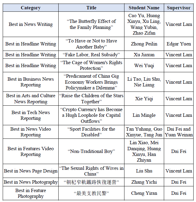The Department of Communication is proud to announce that 20 students from the Media and Communication Studies and International Journalism programs have won 13 awards at the 2022 China Daily Campus News competition. This builds on our success in the 2021 competition where our students won 6 awards.
