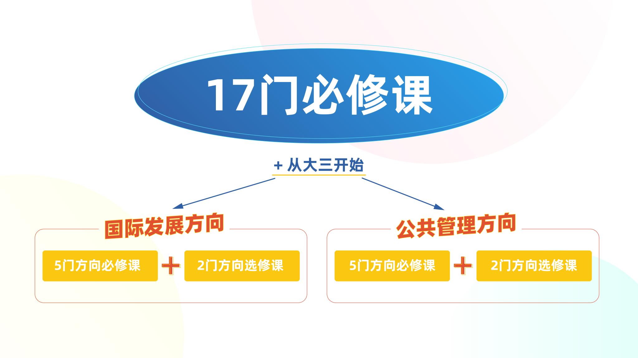 2024-2025学年入学学生须完成共17门必修课和7门专业方向课程,即5门方向必修课和2门方向选修课。本专业将提供两个专业方向供学生选择。学生们将在大三时根据自己的兴趣在公共管理或国际发展两个方向中选择继续深造的课程内容。