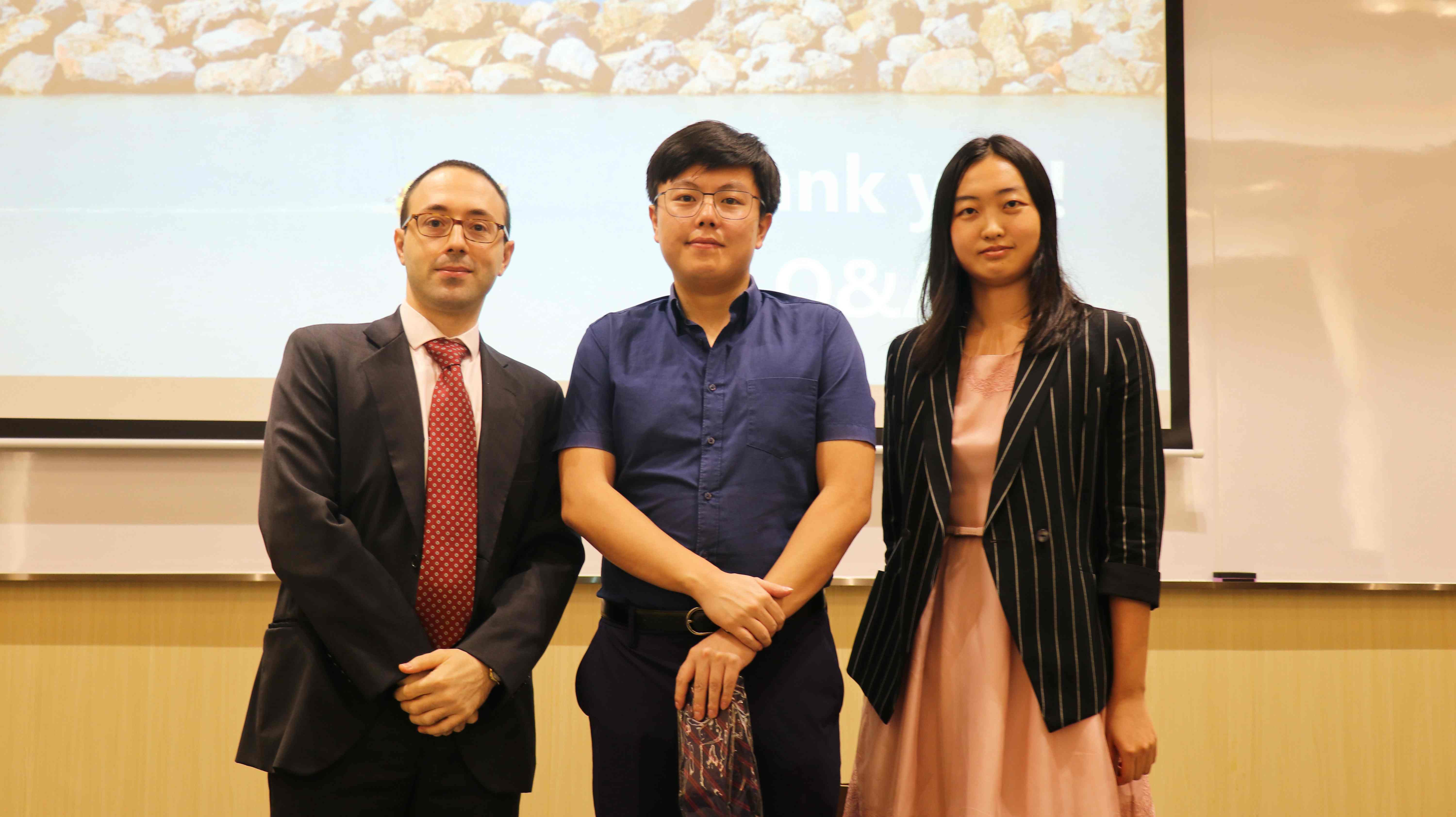 合影(从左到右:UIC全球化与发展专业课程主任Monaco博士,云洲智能科技公司国际事业部总经理张先生, UIC全球化与发展专业助教何熹)