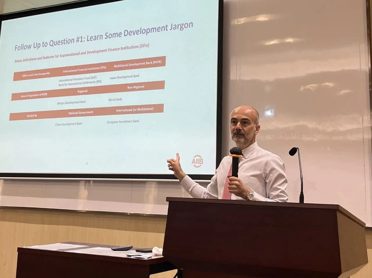 Nardelli先生就亚投行的性质和使命,向现场众多同学和教职员工做出了详细且深入的讲解。同时,Nardelli先生全面地介绍了此类多边开发银行(MDB)在促进南方国家的发展和可持续性方面的作用。