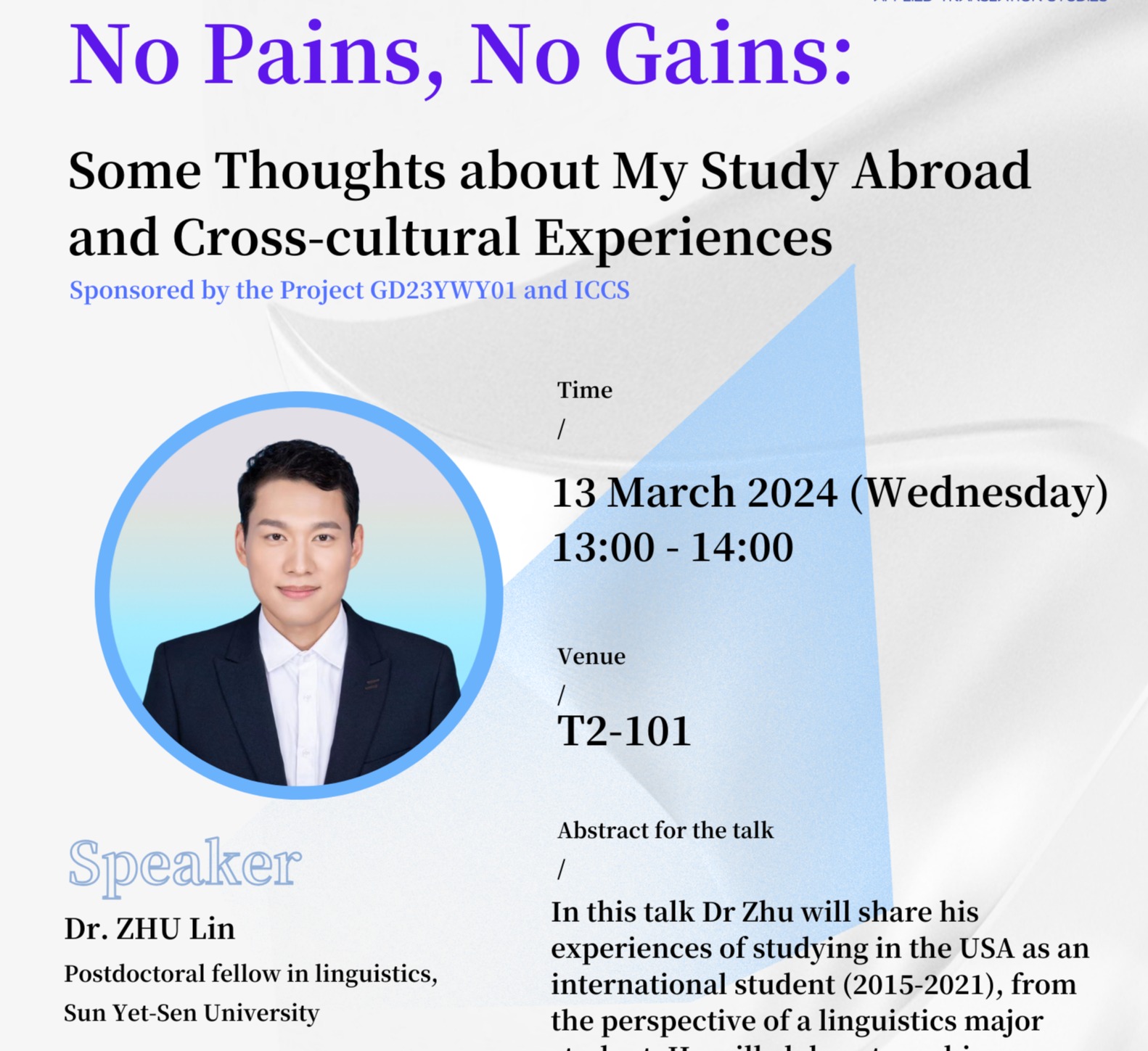 The Institute of Cross-cultural Studies and Project GD23YWY01 co-sponsored this invited talk by Dr. Zhu Lin, a post-doctoral fellow in linguistics at Sun Yet-Sen University. Dr Zhu shared his experiences of studying in the USA as an international student (2015-2021), from the perspective of a linguistics major student. He elaborated on his experiences as an English as a second language speaker ...