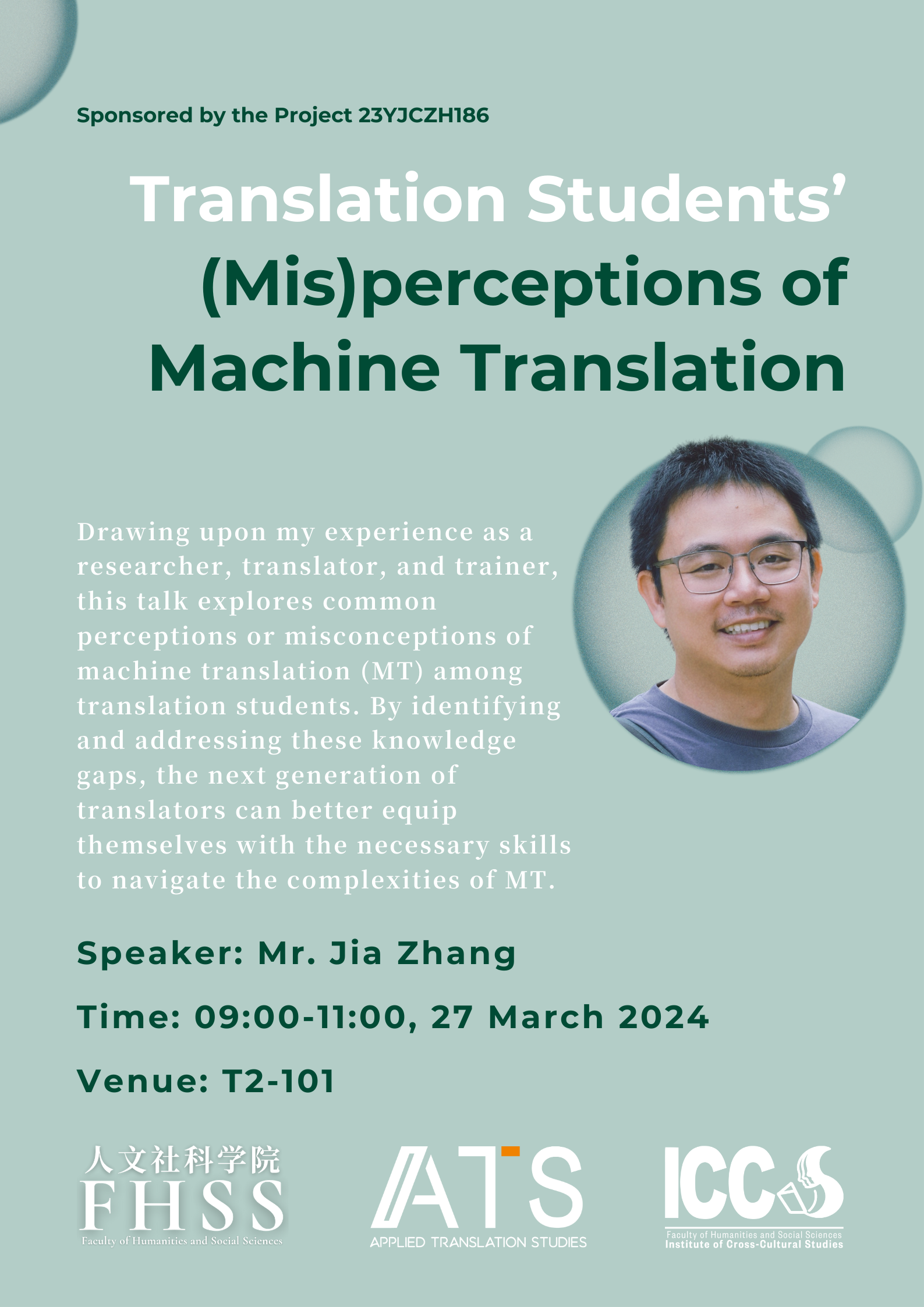 The Institute of Cross-cultural Studies and Project 23YJCZH186 co-sponsored this invited talk by Mr. Jia Zhang who drew on his experience as a researcher, translator, and trainer to explore common perceptions or misconceptions of machine translation (MT) among translation students. He stressed that by identifying and addressing these knowledge gaps, the next generation of translators can better equip themselves with the necessary skills to navigate MT complexities.