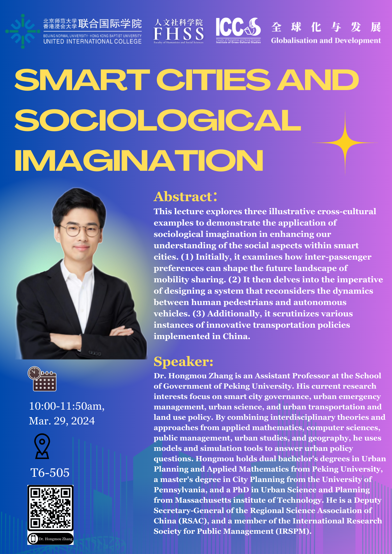 The Institute of Cross-cultural Studies and the Department of Social Sciences at UIC co-sponsored this invited talk by Dr. Hongmou Zhang, an Assistant Professor at the School of Government at Peking University. During the talk, Dr Zhang explored three illustrative cross-cultural examples to demonstrate the application of sociological imagination in enhancing our understanding of social aspects of smart cities. The talk was moderated by Dr. Shuang Wu from the Globalization and Development Program. It was funded by the National Natural Science Foundation of China Youth Project [42301281] and the Ministry of Education Humanities and Social Sciences Research Foundation Youth Project [23YJC840024].
