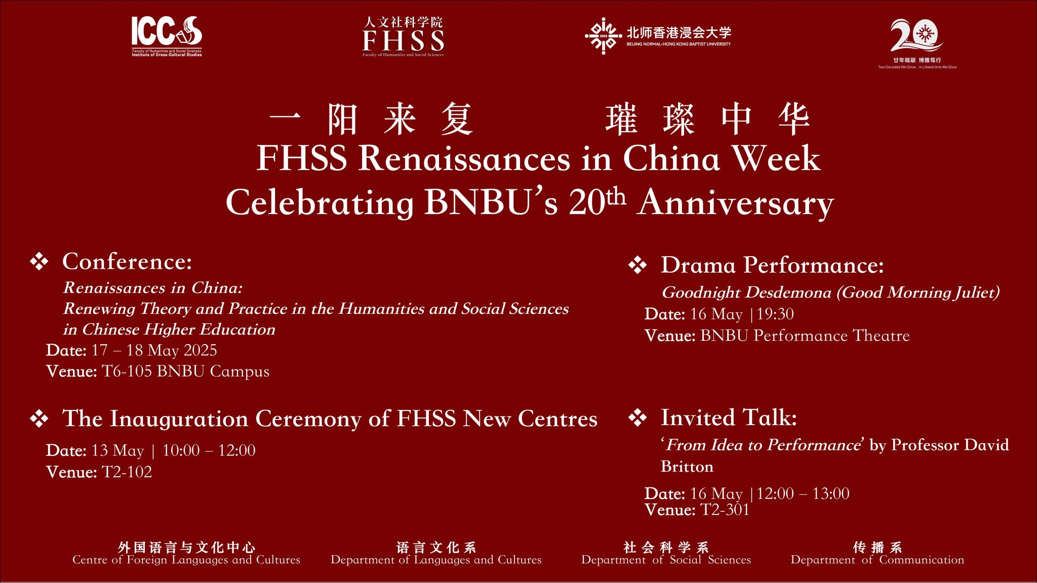 Twenty-first century academia faces unprecedented challenges in the face of intense technological and geo-political tendencies that require calculated investment and innovation within and across disciplines as a collective response. This watershed moment signifies a complex set of 'rebirths' of centuries-old academic, literary, and disciplinary practices. Drawing upon the symbol of the Renaissance - a concept and era representing an intense and rich period of cultural, artistic, political, and economic ‘rebirth’ in Europe, this conference explores these challenges, their inherent complexities, and our responses to them within the humanities and social sciences. The conference theme is immediately pertinent to China given its unprecedented rise in prosperity and resurgent global presence. Its relevance further extends to Beijing Normal-Hong Kong Baptist University (BNBU) which celebrates its 20th anniversary in 2025.