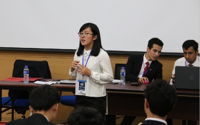 来自大一外国语言文学专业的姚雨彤同学担任联合国第一委员会阿富汗代表,就“阿富汗的安全议程”这一问题与在场代表进行讨论。她表示,UIC的全英文教学对自己在模联会场上的发挥很有帮助,不仅使她克服了全英文背景文件的阅读和文件写作,更使她克服了对英语演讲的恐惧,使自己能够在会场里应用自如。