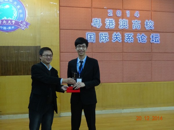 此次比赛,中山大学、暨南大学获得银奖,澳门大学、广东外语外贸大学则摘得铜奖。比赛评委为:暨南大学国关学院院长张振江教授、暨大国关学院党委书记陈斌、暨大国关系主任李皖南副教授、暨大美国研究中心主任吴金平教授、中山大学亚太所王学东副教授、中山大学亚 太所黄迎虹讲师、广东外语外贸大学王树春教授、澳门大学政府与行政学系陈定定助理教授与UIC政治与国际专业助理教授吴崇涵博士。