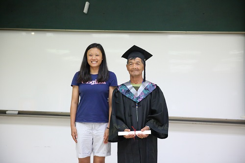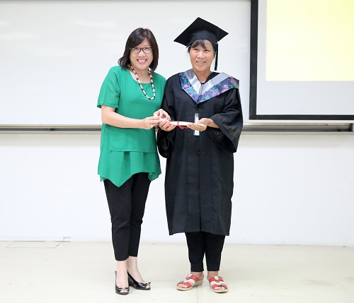 课程结束后,长者们穿上学士袍,戴上学士帽拍照,兴奋不已。四维教育协调处处长关凯玲博士、社会工作与社会行政专业署理课程主任吴耀辉先生和全人教育办公室的唐艺珊老师为大家颁发了证书。
