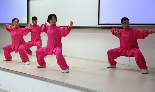 下午,全人教育办公室体育中心的方文泽老师为大家讲授健康气功课程,并邀请他的四位学生表演“八段锦”气功操。随后,方老师教三个简单的动作,大家都站起身认真学习。