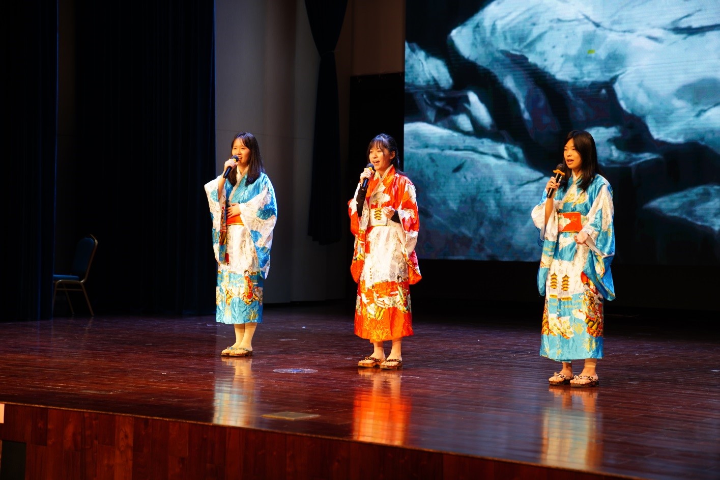 日文社的三位同学以饱满的热情为大家演唱了一首日文歌曲。当音乐渐渐响起,三位身穿和服的女生在台中央载歌载舞。欢快愉悦的曲调、充沛的情感和纯正的日语让观众沉醉其中。