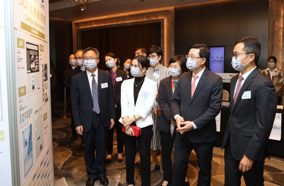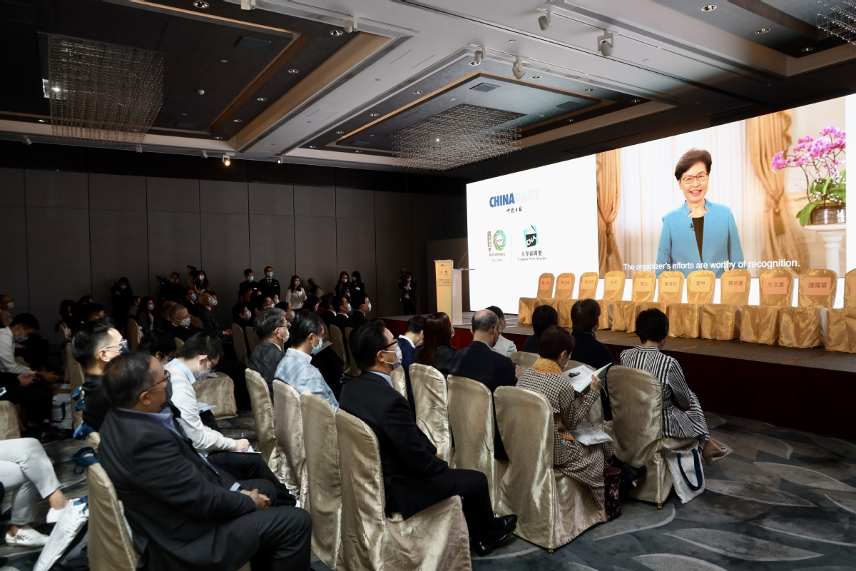 香港特别行政区行政长官林郑月娥在视频贺辞中表示,由中国日报(香港版)设立的大学新闻奖评选活动今年踏入10周年,活动的顺利举行为海峡两岸暨港澳地区的传媒学生提供了独一无二的互动交流平台。香港特别行政区政务司司长李家超主持颁奖典礼并致辞,香港中联办宣传文体部副部长郑琳等出席。