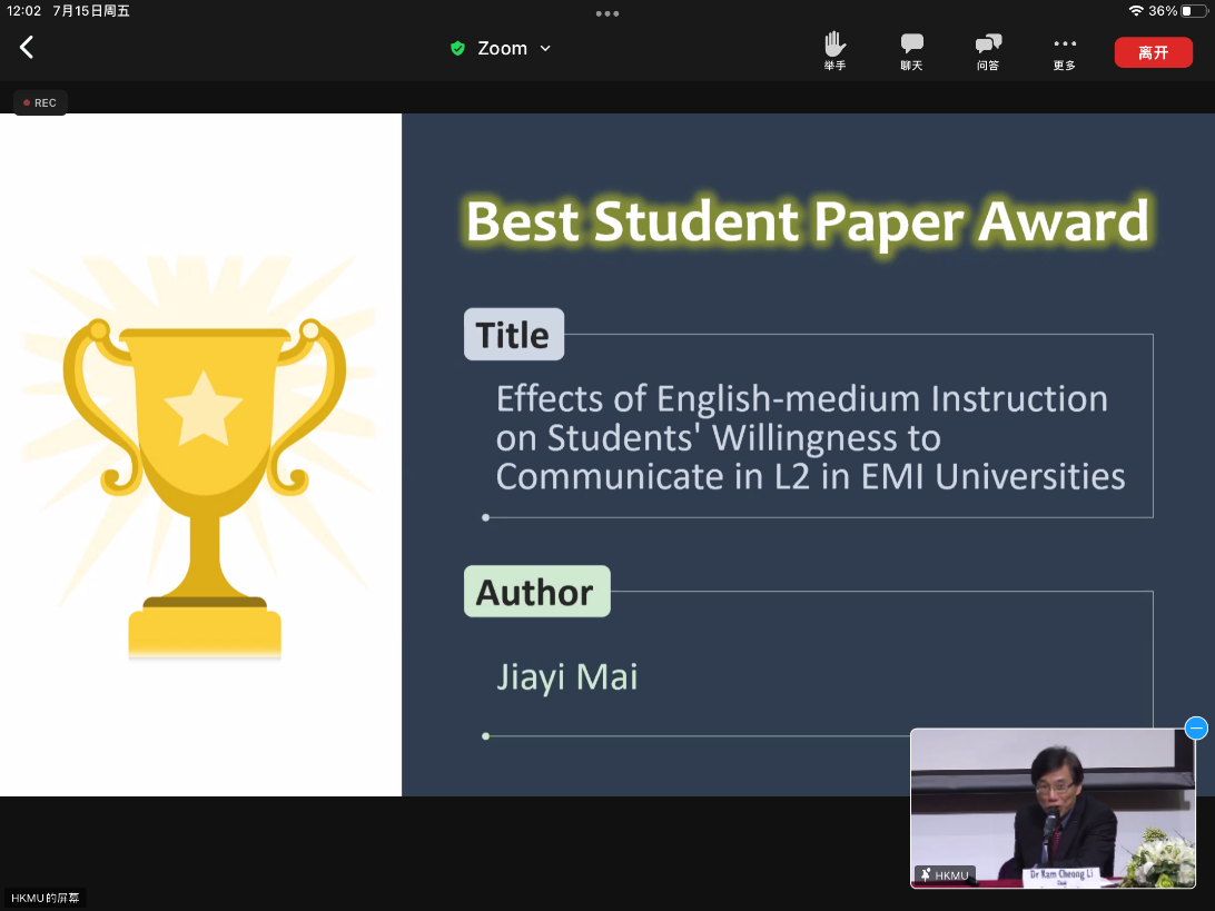 大会宣佈麦嘉仪同学获得最佳学生论文奖
