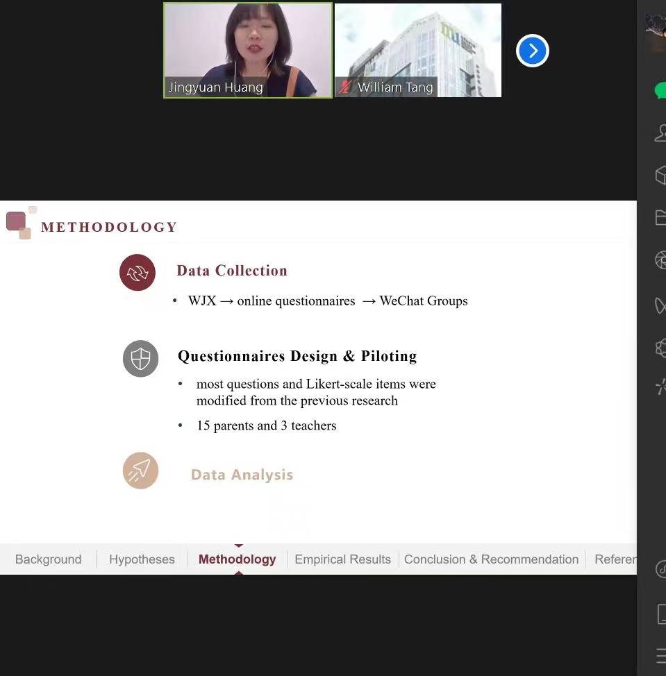 非常荣幸能够在ICOIE2022分享我的研究。我的研究致力于调查以中文为主要教学语言的老师和家长对于双语幼儿园的看法及其影响因素。我希望通过ICOIE这个平台,让更多人了解到由于社会经济因素导致的英语教育资源的分布不均以及其对于第二语言学习成就的影响,从而推动中国幼儿阶段双语教育的发展。感谢Dr. Juyoung Lee, Dr. Edith Yan和Dr. Jackie Yoeh对我的指导,感谢人文与科学学部学生研究基金的支持,感谢我的父母好友同伴以及所有受访者对我的无私帮助与鼓励。