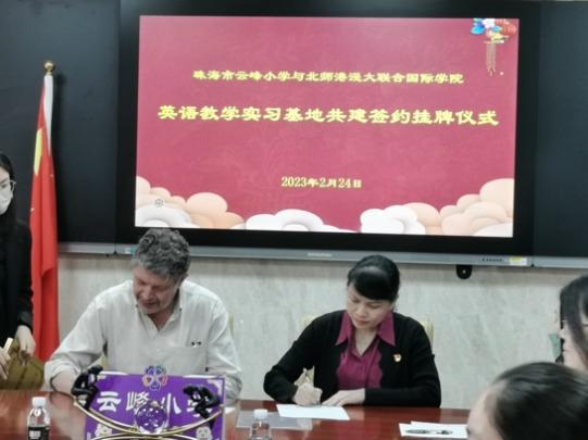 珠海香洲区云峰小学与北京师范大学-香港浸会大学联合国际学院(UIC)共建英语教学专业实习基地,签约挂牌仪式于2023年2月24日在云峰小学举行。