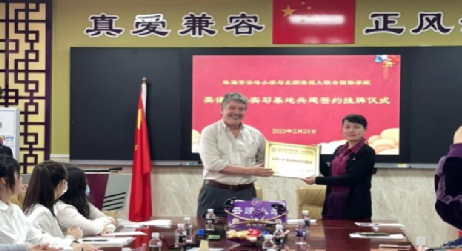 UIC人文社科学院副院长John Corbett教授(左)与云峰小学张丽慧校长(右)共同签订合作协议书,并颁授“云峰小学英语教学实习基地”牌匾