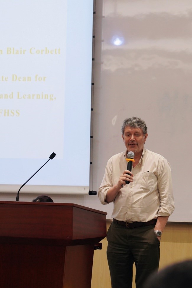 发布会开始,由人文社科学院副院长John Corbett教授发表开幕致辞。他充分肯定了学生们的工作成果,并对未来EPC方向能够在此领域更加精进成熟表示期待。