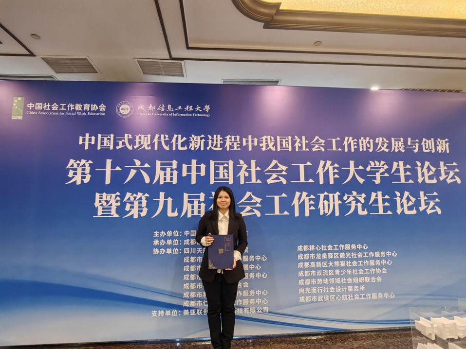 近日,由中国社会工作教育协会主办,成都信息工程大学承办,四川省共计14家社会工作服务机构协办的“中国式现代化新进程中我国社会工作的发展与创新——第十六届中国社会工作大学生论坛暨第九届社会工作研究生论坛”于四川省成都市顺利进行。在本次论坛中,我校24届社会工作与社会行政专业学生姚婉谊投稿的论文"广东省社区居民安宁疗护态度研究"在本科组比赛中荣获二等奖。
