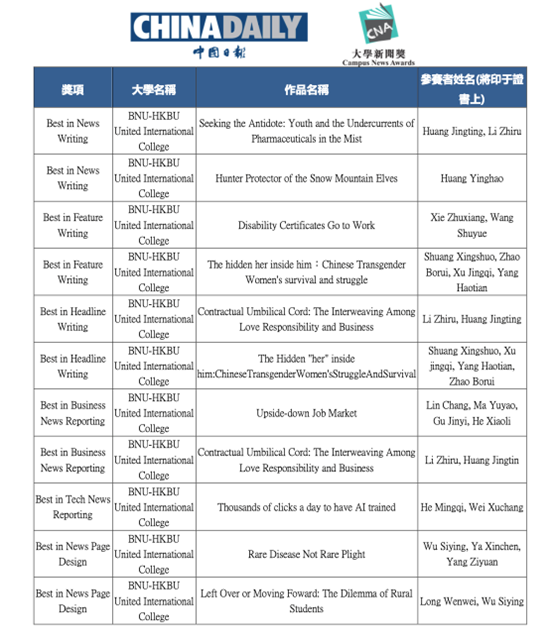 Eleven outstanding works from UIC have been nominated for the China Daily Campus News Awards across six main categories: Best in News Writing, Best in Feature Writing, Best in Headline Writing, Best in Business News Reporting, Best in Tech News Reporting, and Best in News Page Design.
