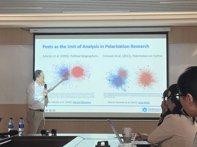 在讲座中,祝教授分享了自己的学术转型之路。他回顾了从最初的agenda setting研究,到e-social science研究,再到如今结合计算与AI方法的传播学研究的历程。他提到,做研究的过程是不断自我探索和深化的过程。尽管专注于计算传播研究,祝教授强调自己并非单纯的“方法论者”,而是从未放弃传播学理论的贡献,始终致力于深入探索媒介效果。
