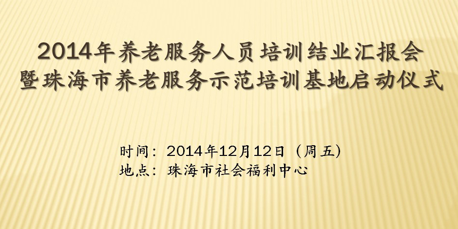 该基地的落成受到市局领导的深切关注,为了让开展养老服务的单位都能在第一时间感受基地的建设成果并有实地学习的机会,在2014年珠海市养老服务人员培训汇报大会(UIC-CSMRS承办)之际,养老服务示范培训基地将举行启动仪式。