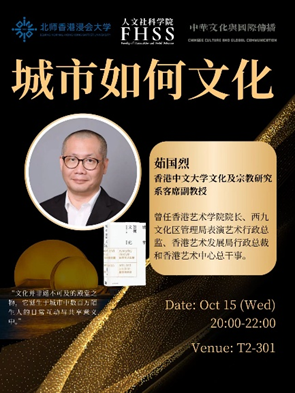 10 月 15 日,北师香港浸会大学人文社科学院韩子奇院长,特邀香港中文大学文化及宗教研究系茹国烈客座副教授,在此开展了以 “城市如何文化” 为主题的深度工作坊。