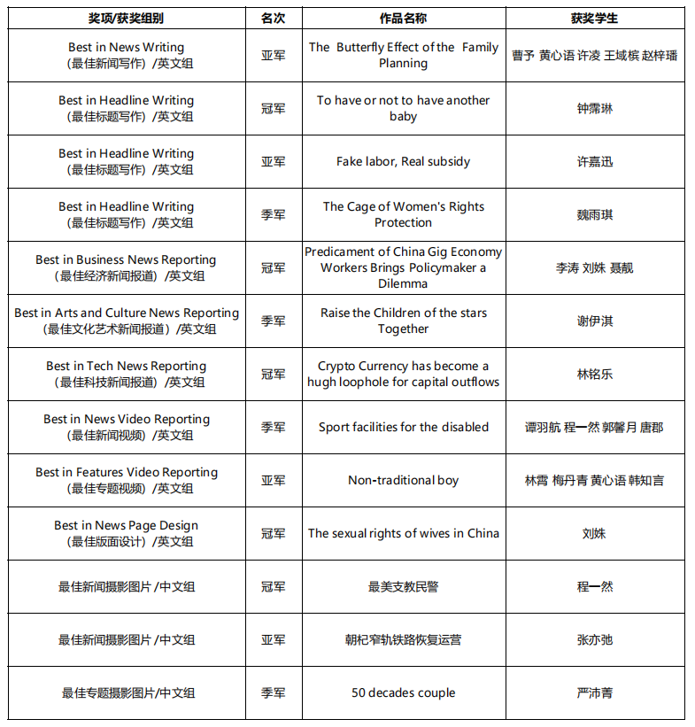 曹予、黄心语、许凌、王域槟、赵梓璠五位同学的作品获得最佳新闻写作的亚军。他们提到,团队在选题、搜索资料、寻找受访者等过程中克服了诸多困难,很高兴他们的付出得到了比赛组委会的认可,也特别感谢指导教师林庆宝博士的指导以及受访者的信任。
