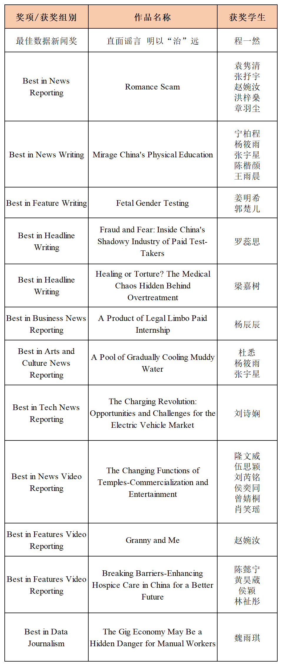 北师港浸大学生获得的英文组奖项包括最佳新闻报道、最佳新闻写作、最佳新闻特写、最佳标题(2项)、最佳经济新闻报道、最佳文化艺术新闻报道、最佳科技新闻报道、最佳新闻视频、最佳专题视频(2项)、最佳数据新闻;中文组奖项为最佳数据新闻奖。北师港浸大获最踊跃参与学校奖。