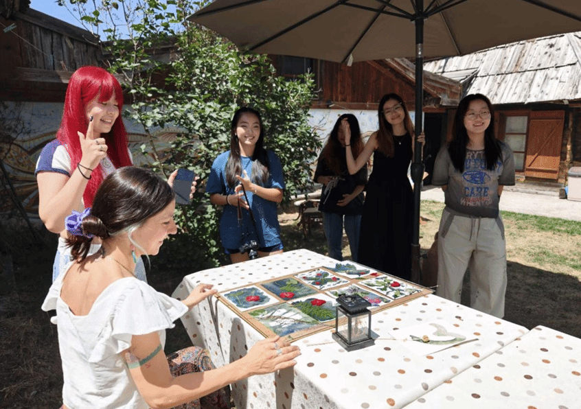 拍摄与展映之余,学生们还体验了1842年发明的蓝晒工艺,用野花创作“蓝图”。随着阳光洒落,化学物质渐渐显现出图案,“科学就这样孕育出属于它的诗意,”李雨珊举着渐渐显现的作品感叹道。在画廊厨房里,学生们做了中餐,和当地人交流菜谱,又一次拉近着彼此的距离。