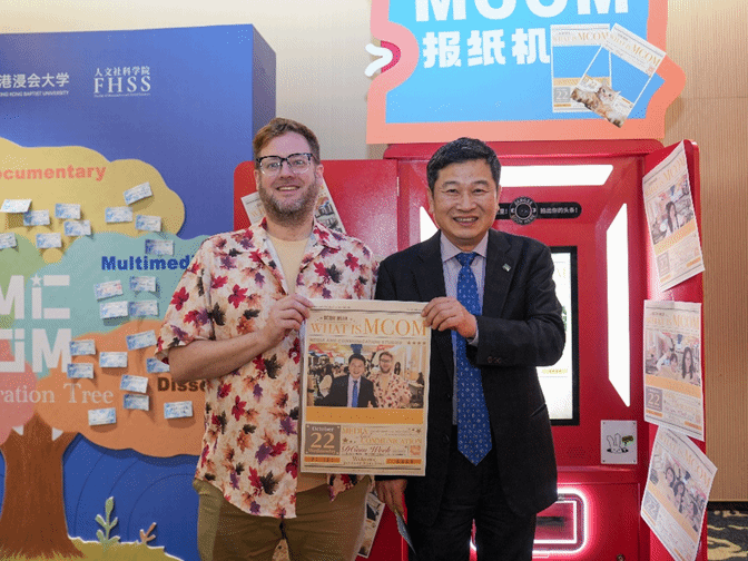 Prof. CHEN Zhi and Dr. Jesse Owen Hearns-Branaman took a photo with the Newspaper Photo Booth of MCOM.