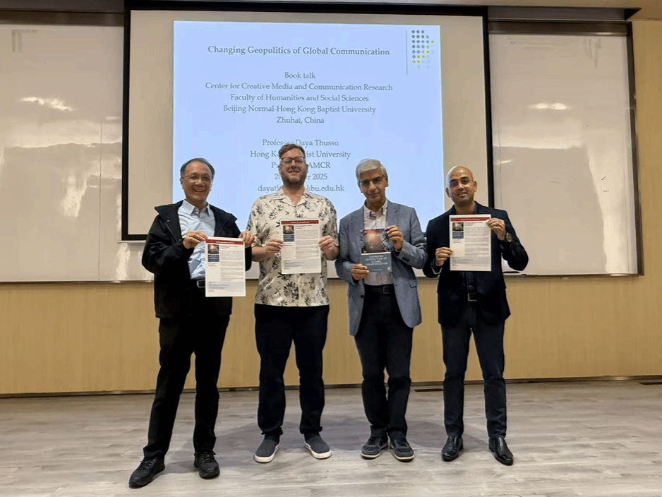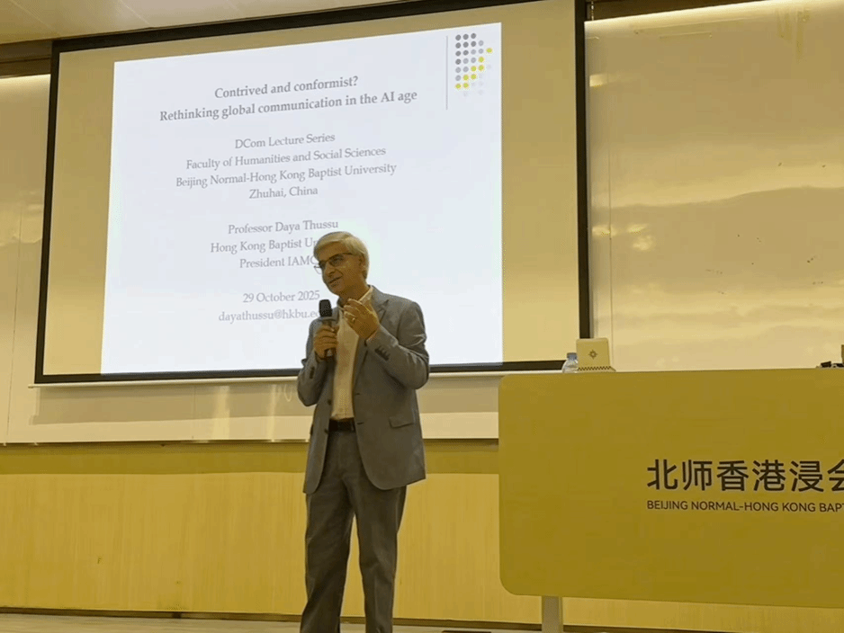 Prof. Daya Thussu, a globally renowned scholar from Hong Kong Baptist University and President of the International Association for Media and Communication Research (IAMCR), gave two lectures titled “Changing Geopolitics of Global Communication” and “Contrived and conformist? Rethinking global communication in the AI age” in Beijing Normal Hong Kong Baptist University during Oct. 28 and 29. These lectures are co-sponsored by the Department of Communication (DCom) and the Center for Creative Media & Communication Research (CCMCR). Dr. Anilesh Kumar, Assistant Professor in the Department of Communication, hosted the lectures.