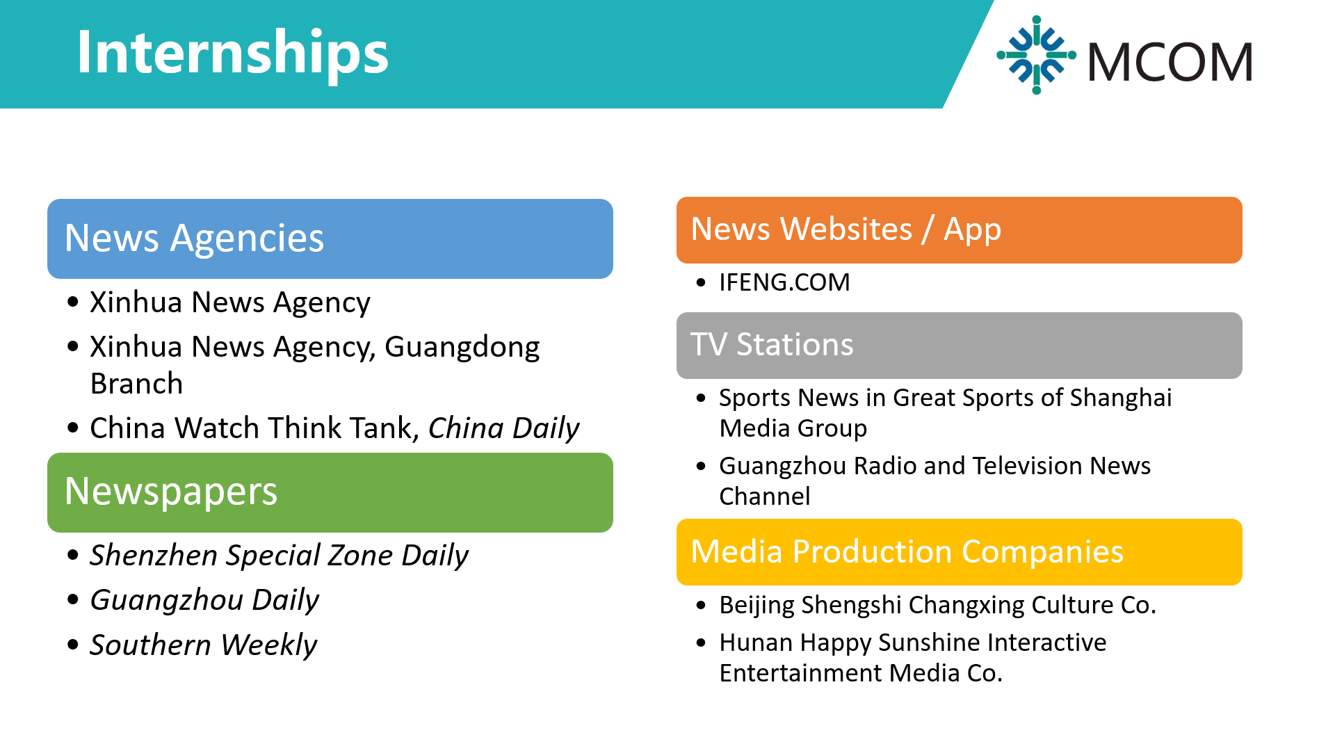 Students are highly encouraged to undertake internships during their undergraduate years. Most students would have acquired internship experience before graduation. The Media and Communication Program also assists students in their search for internship opportunities by connecting them with and introducing them to employers and industrial partners. Students have the option to practice off-campus internships in the media industry during the summer of Y3.