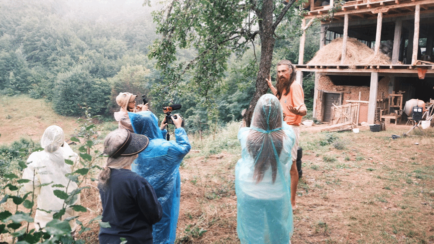 Students filming pro-basketball player turned farmer and yoga teacher, Jovan Stefanov, who believes humans need to reintegrate with nature